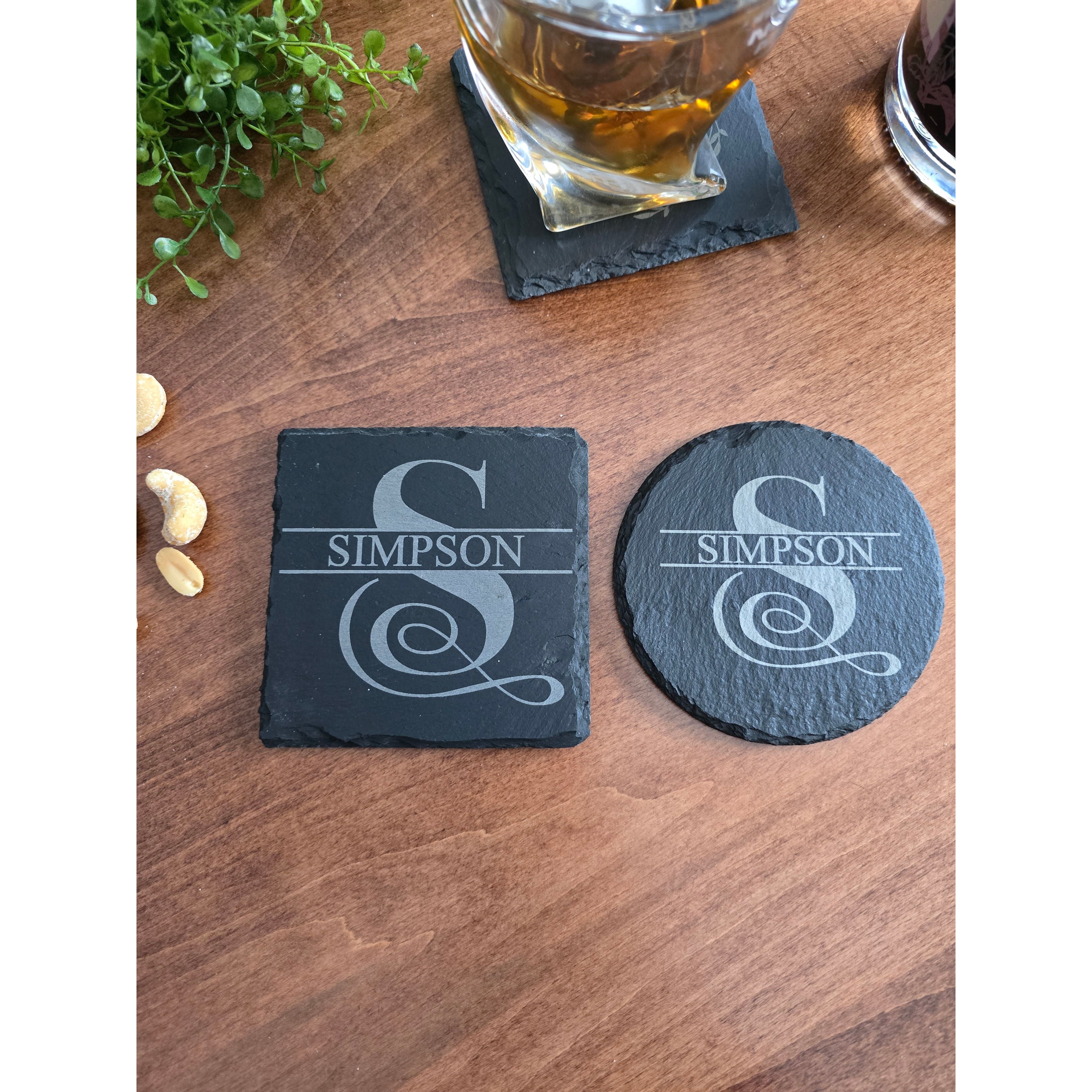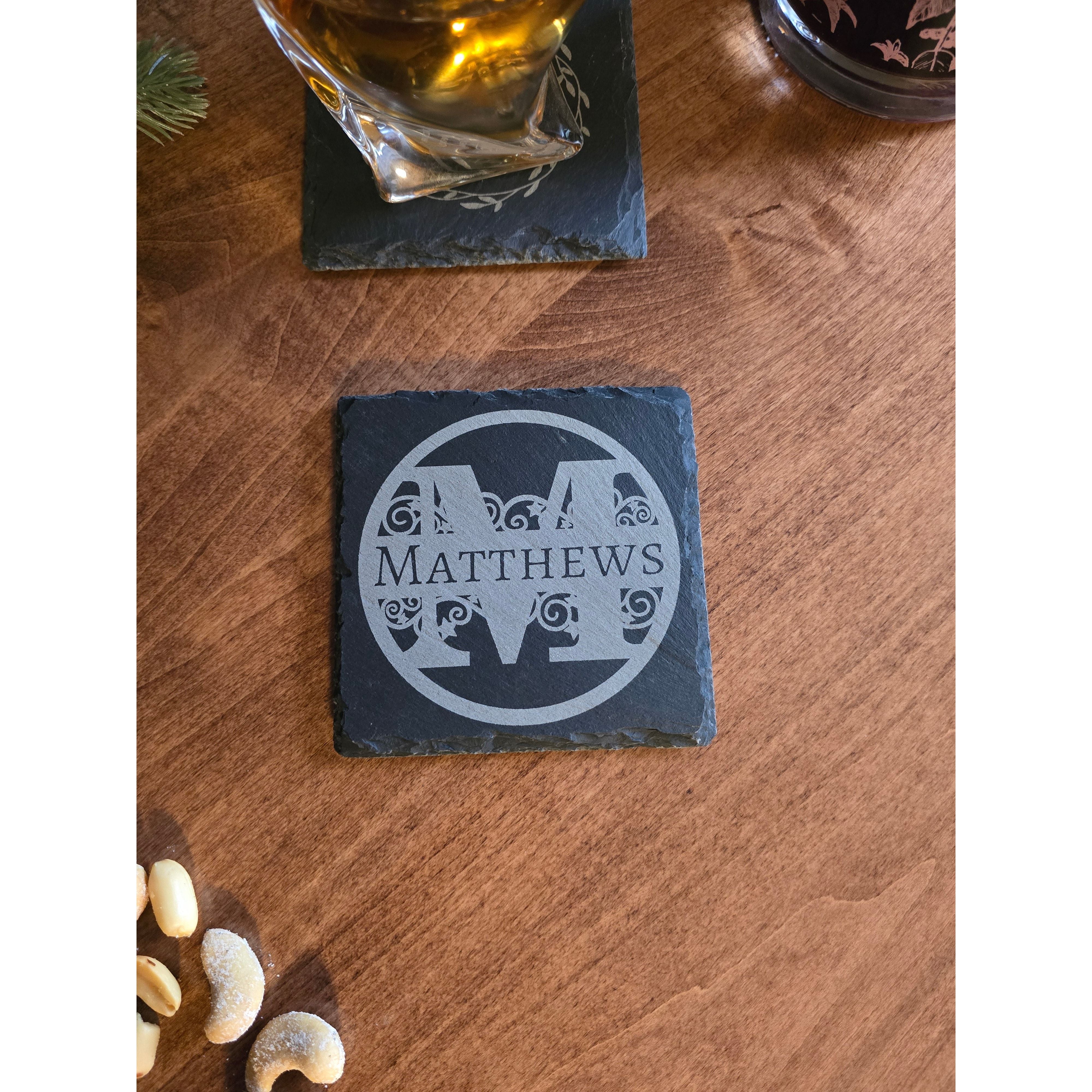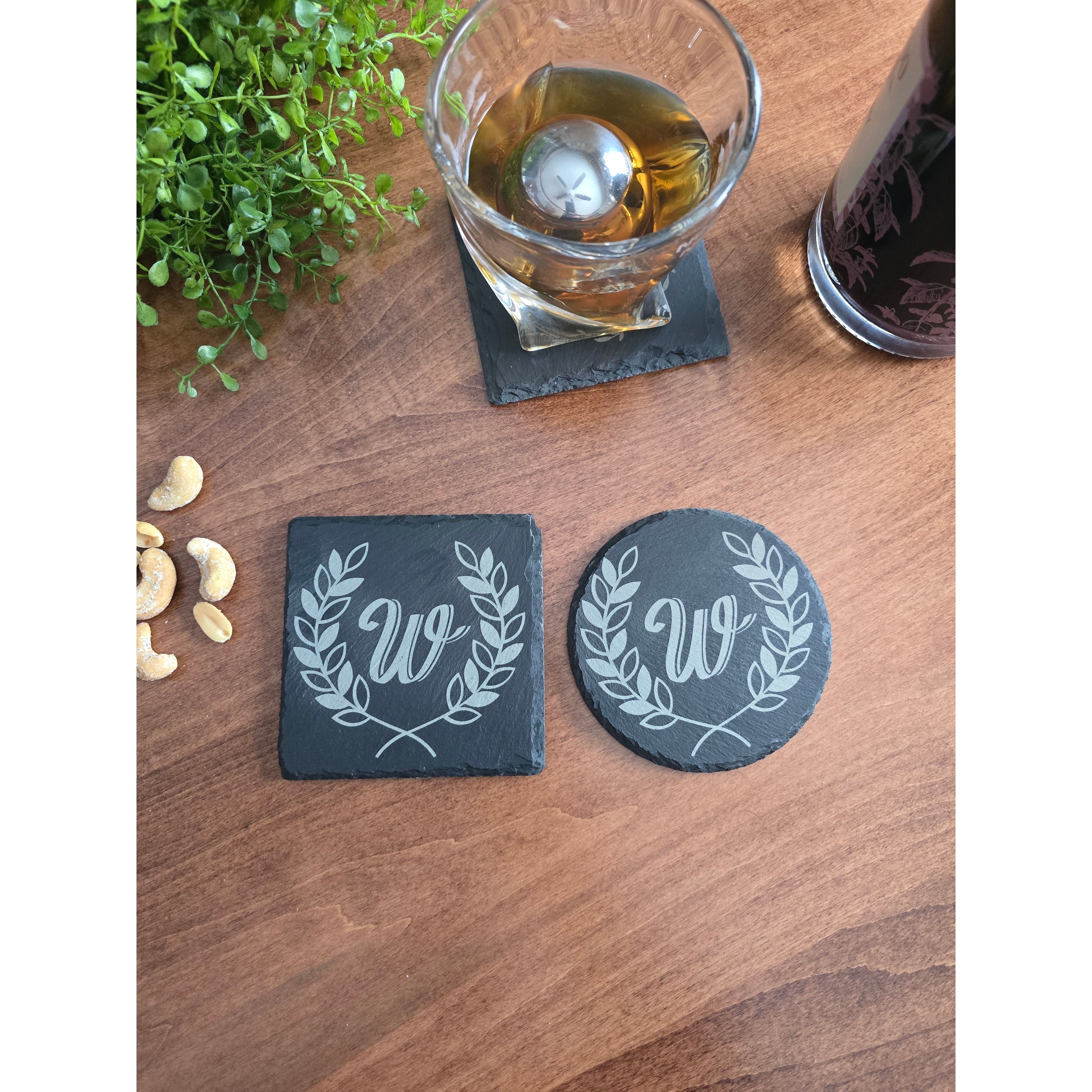 Personalized Slate Monogram Coasters Caligraphy Font Wreath