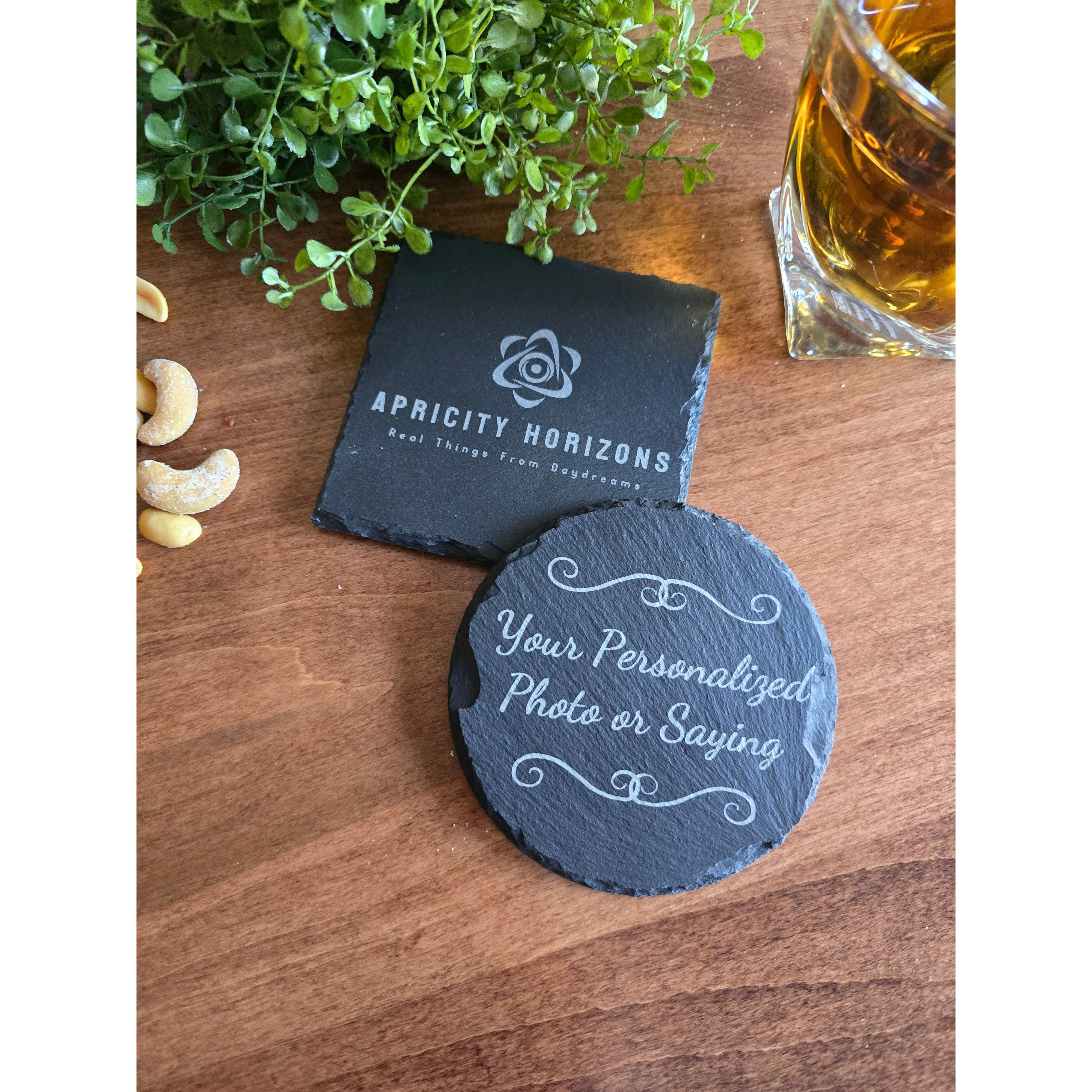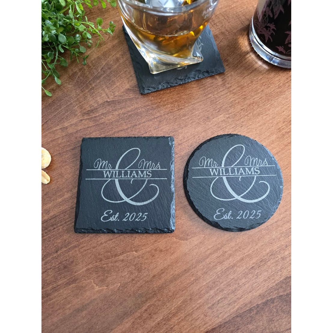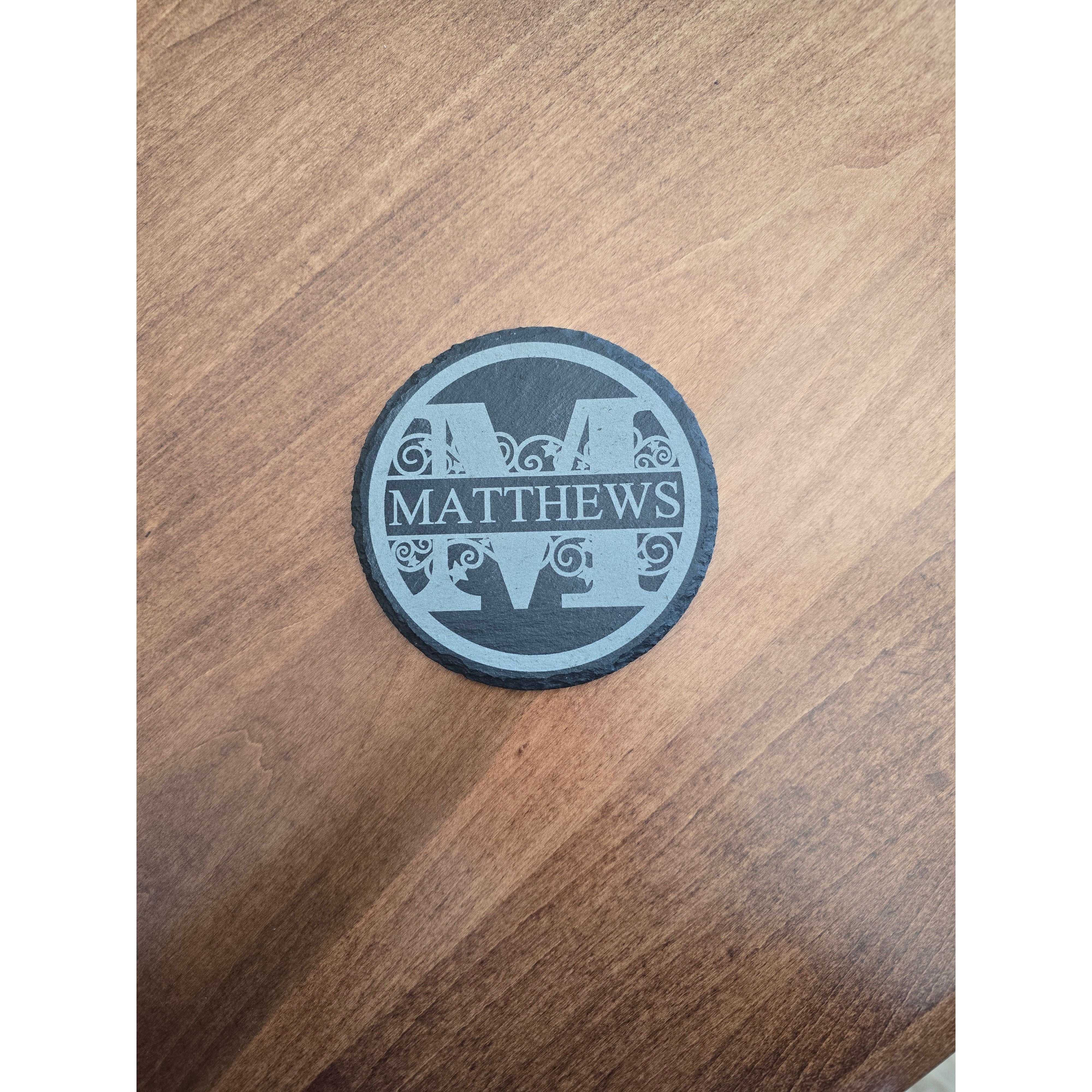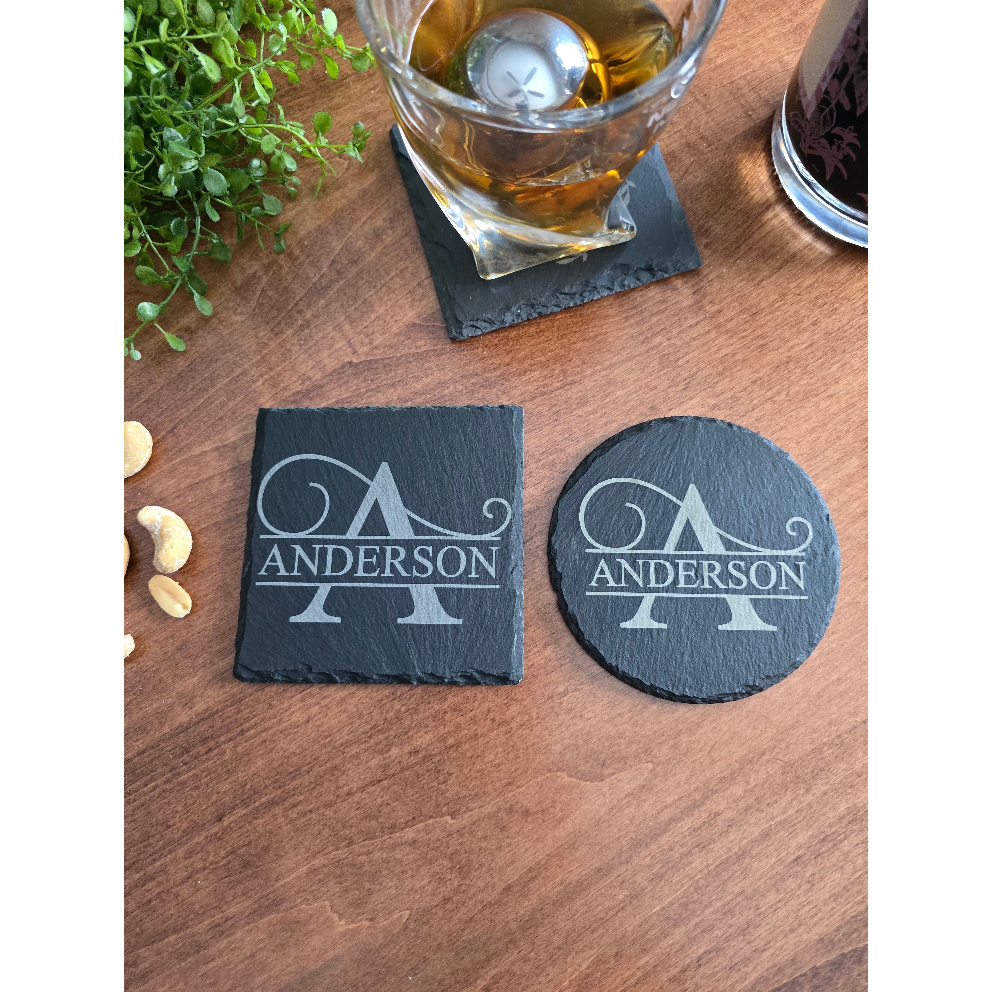 Personalized Slate Monogram Coasters Caligraphy Font Wreath